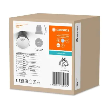 Ledvance Spot LED Twist Pro Aluminium Blanc Réflecteur 5W 400lm 30D - 840 | 70mm - Diamètre 65mm - IP20 est un spot LED encastrable. Ce luminaire est conçu pour un éclairage d’accentuation pour un usage domestique ou bien professionnel. LED Intégré, ce spot LED Ledvance en Aluminium a besoin d’une place nécessaire de 65mm de largeur et mm de profondeur. Ce luminaire est compatible avec une ampoule GU10, il est important de faire attention si vous décidez de changer d’ampoule.